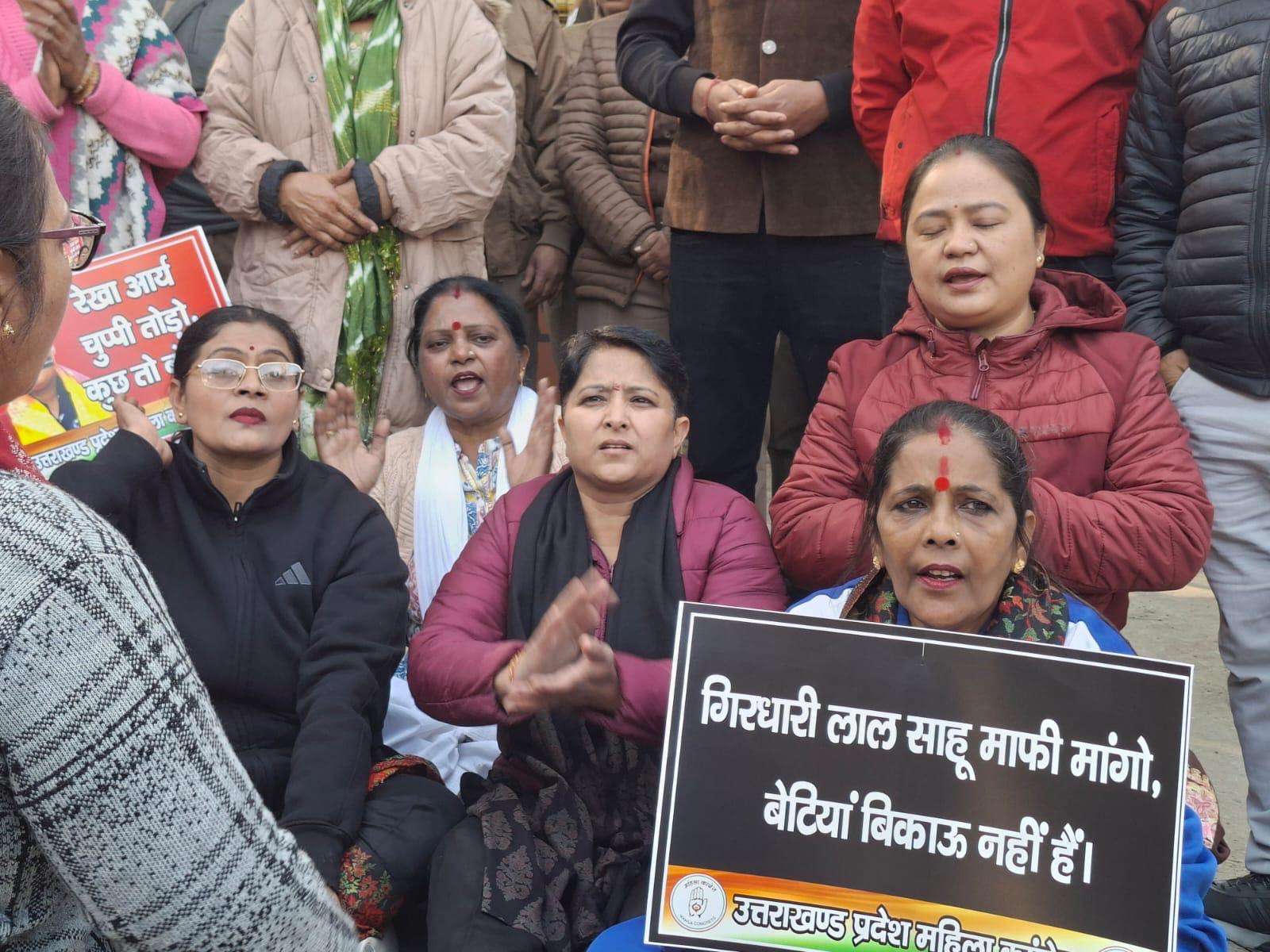 ज्योति रौतेला के नेतृत्व में महिला कांग्रेस ने गिरधारी लाल साहू के खिलाफ थाना डालनवाला में भी मामला दर्ज कराते हुए कानूनी कार्रवाई किये जाने की मांग की। ज्योति रौतेला ने कहा कि गिरधरी लाल साहू का यह बयान भाजपा की विकृत मानसिकता को दर्शाता है जिनकी नजरों में महिलाओं की अस्मिता की कीमत लगाई जाती है।