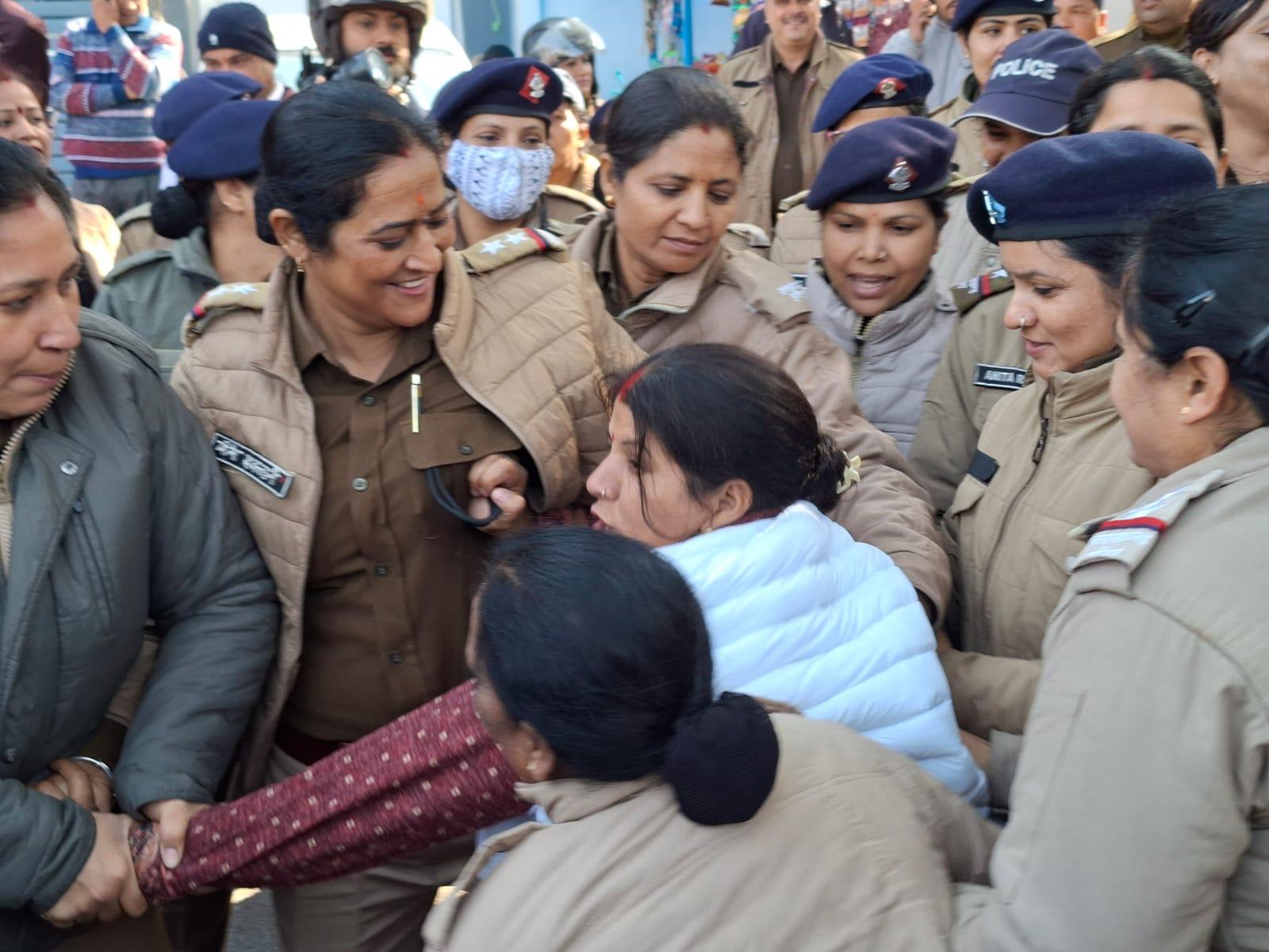 पूर्व निर्धारित कार्यक्रम के तहत आज महिला कांग्रेस के कार्यकर्ता प्रदेश अध्यक्ष ज्योति रौतेला के नेतृत्व में यमुना कॉलोनी गेट पर एकत्र हुए जहां से नारेबाजी करते हुए मंत्री रेखा आर्य के आवास की ओर कूच किया।