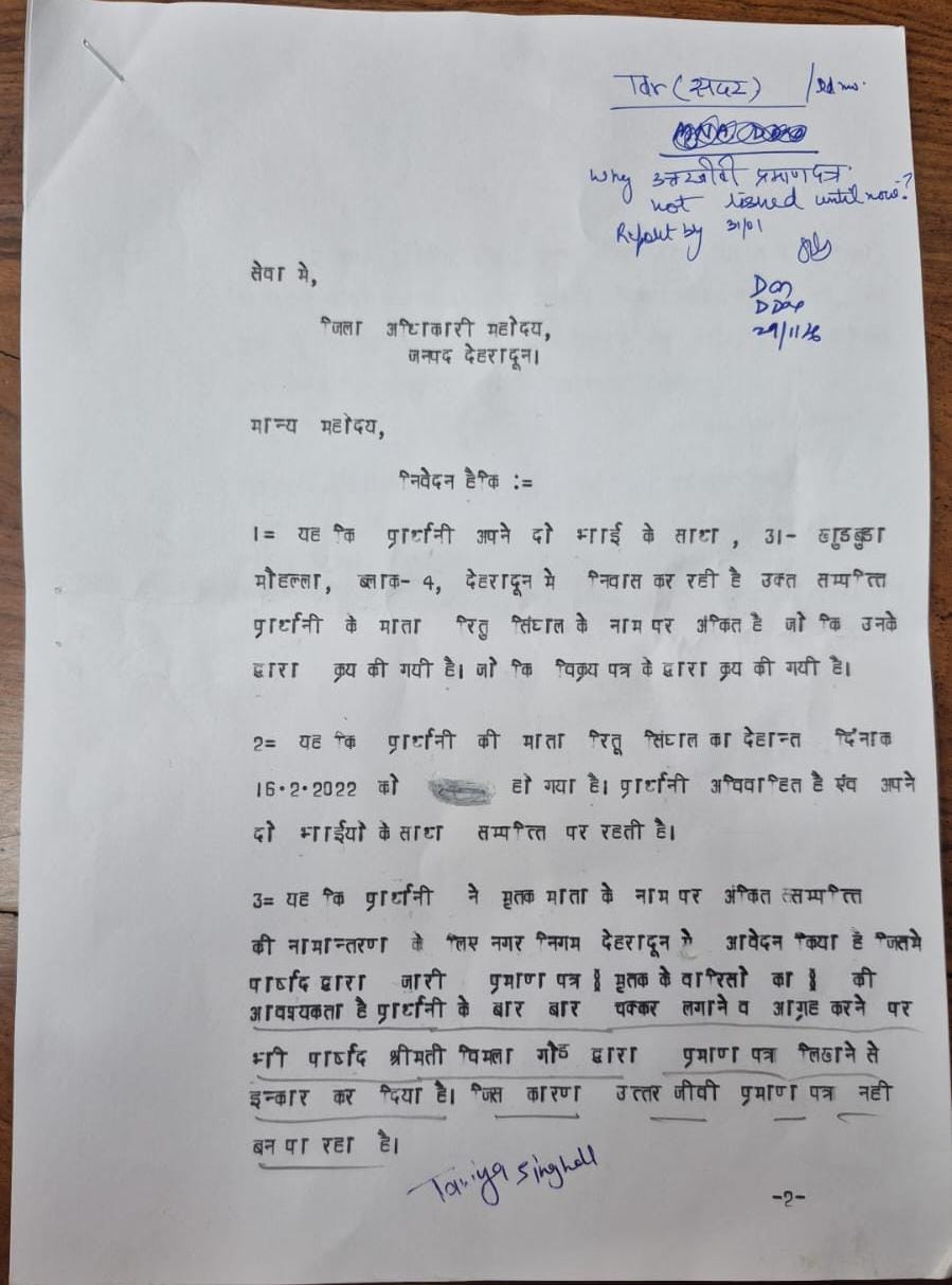 खुड़बुड़ा निवासी तान्या सिंघल ने जिलाधिकारी को प्रार्थना-पत्र प्रस्तुत कर अवगत कराया कि उनकी माता का निधन दिसंबर 2022 में हो गया था। नगर निगम के संपत्ति रजिस्टर में अपना नाम दर्ज कराने हेतु उन्हें उत्तरजीवी प्रमाण पत्र की आवश्यकता थी। उन्होंने बताया कि वह लंबे समय से परेशान थीं और विभिन्न स्तरों पर प्रयास करने के बावजूद समाधान नहीं हो पा रहा था।