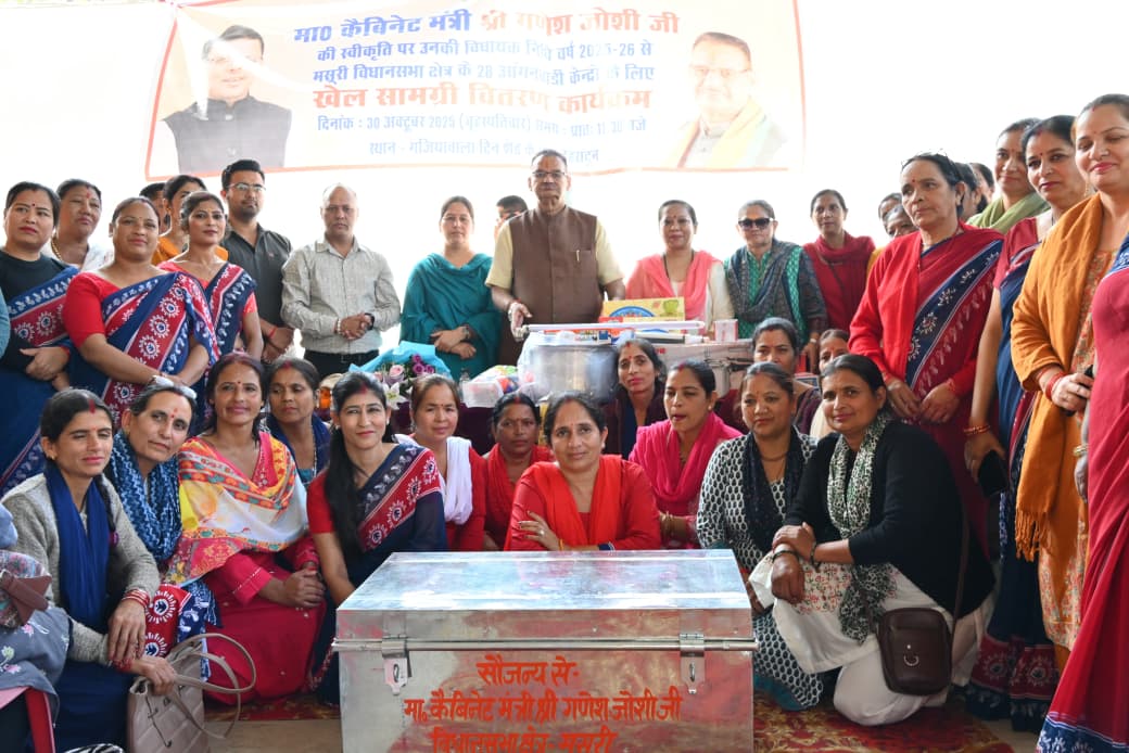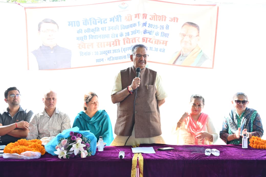 श्रमिक मंत्र,देहरादून। वीरवार को कैबिनेट मंत्री गणेश जोशी ने देहरादून के गजियावाला में मसूरी विधानसभा क्षेत्र के अर्न्तगत विकाखण्ड सहसपुर के तहत 15 ग्राम पंचायतों के लिए 28 आंगनवाड़ी केंद्रों को खेल एवं पठन-पाठन सामग्री का वितरण कार्यक्रम।