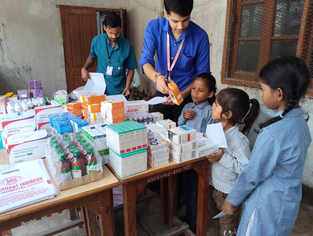 श्री महंत इन्दिरेश अस्पताल की ओर से निःशुल्क जाॅचें की गईं और फ्री दवाइयां भी बांटी गई