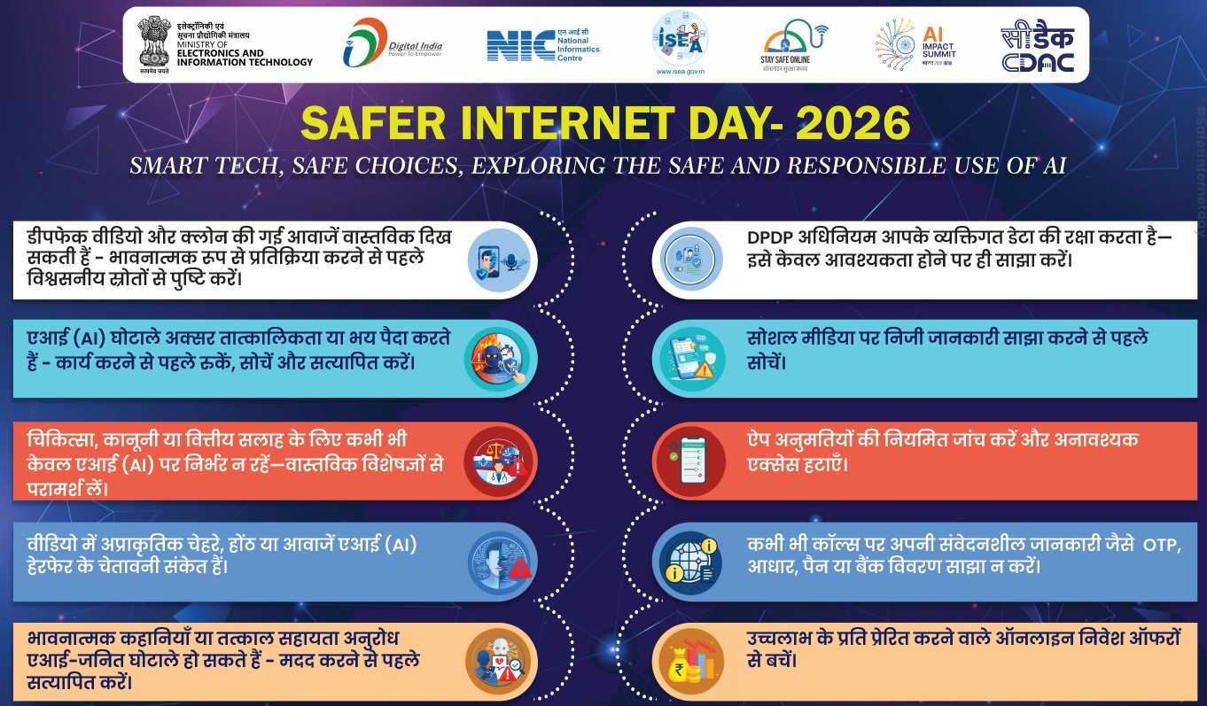 भारत सरकार द्वारा प्रत्येक वर्ष फरवरी माह के द्वितीय मंगलवार को “सेफर इंटरनेट डे” का आयोजन किया जाता है । इसका उद्देश्य डिजिटल दुनिया में बच्चों, युवाओं, महिलाओं और वरिष्ट नागरिकों के लिए एक सुरक्षित और बेहतर इंटरनेट वातावरण को बढ़ावा देना है। यह एक अंतरराष्ट्रीय जागरूकता अभियान है जो जिम्मेदार और सुरक्षित ऑनलाइन व्यवहार को प्रोत्साहित करता है। इस वर्ष सुरक्षित इंटरनेट दिवस “स्मार्ट तकनीक, सुरक्षित विकल्प। ए.आई. के सुरक्षित और जिम्मेदार उपयोग” थीम पर केंद्रित रहा ।