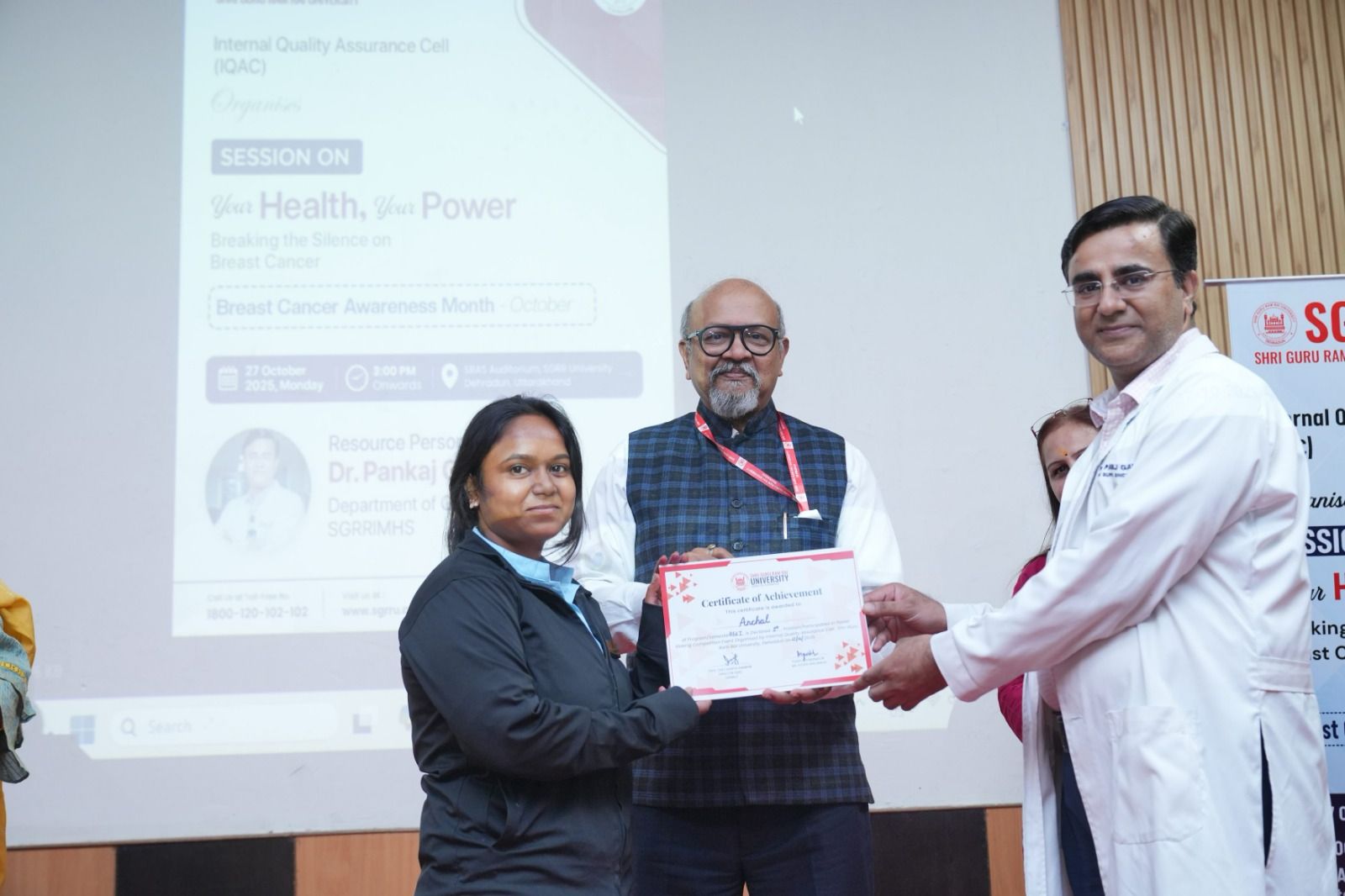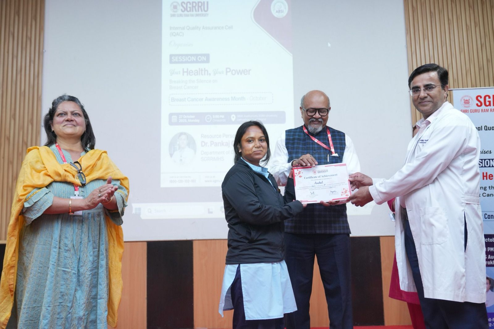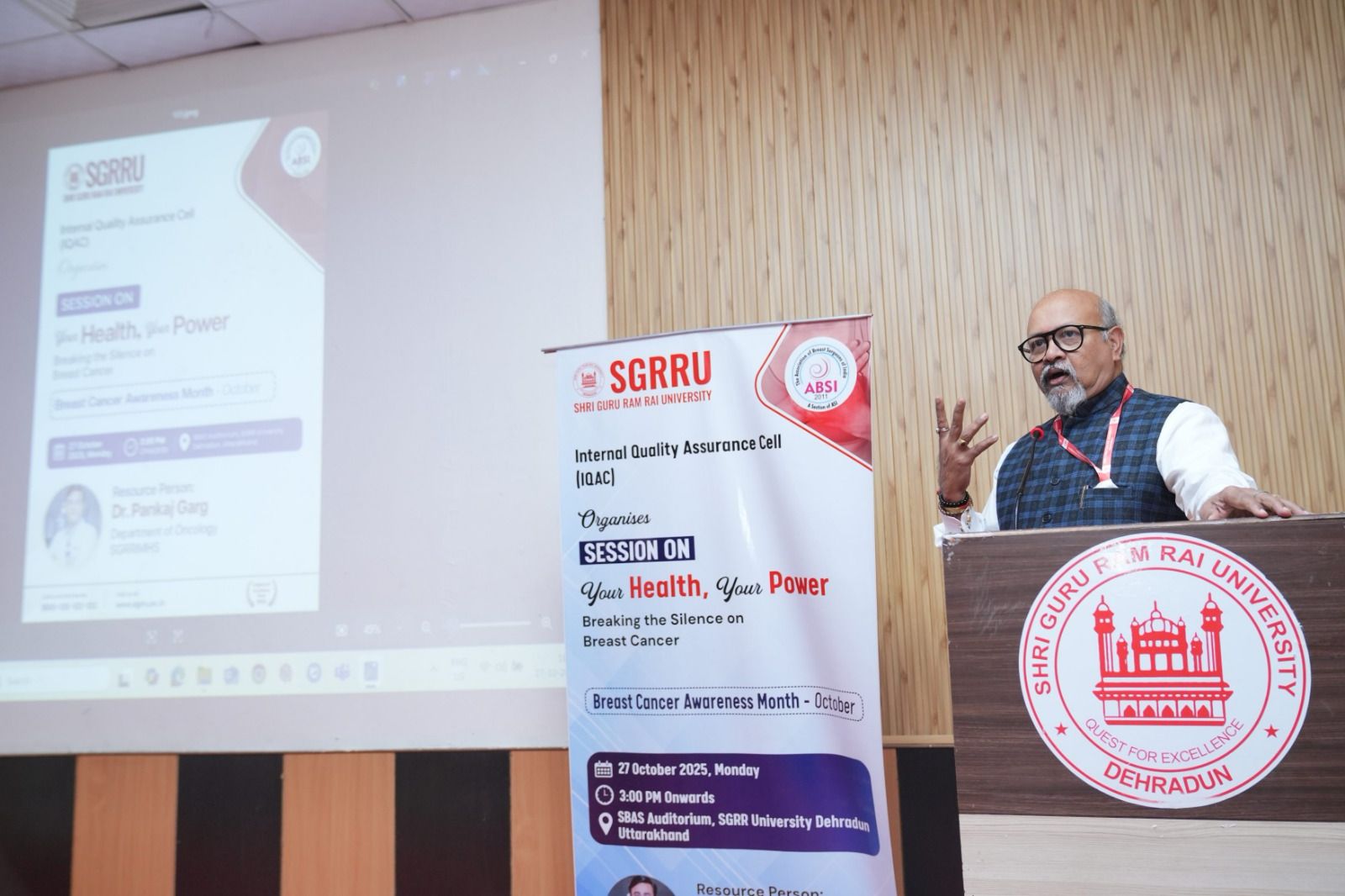 श्रमिक मंत्र, देहरादून। स्तन कैंसर जागरूकता माह के अंतर्गत, श्री गुरु राम राय विश्वविद्यालय के आंतरिक गुणवत्ता आश्वासन प्रकोष्ठ (IQAC) द्वारा पोस्टर मेकिंग प्रतियोगिता एवं अतिथि व्याख्यान का आयोजन किया गया। इस कार्यक्रम का उद्देश्य छात्रों और अध्यापकों में स्तन कैंसर के प्रति जागरूकता बढ़ाना और समय पर जांच एवं आत्म-परीक्षण के महत्व को समझाना था।