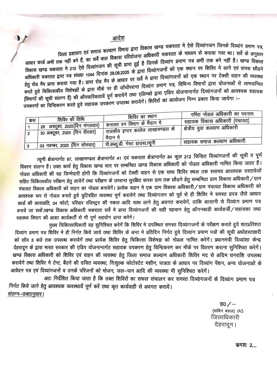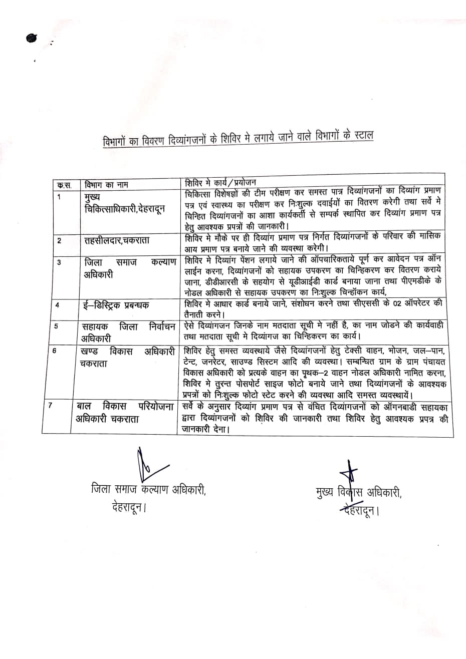 त्यूणी क्षेत्रान्तर्गत 87, लाखामण्डल क्षेत्रान्तर्गत 41 एवं चकराता क्षेत्रान्तर्गत 84 कुल 212 चिन्हित दिव्यांगजनों की सूची व पूर्ण विवरण संलग्न है। उक्त कार्य हेतु विकास खण्ड स्तर पर सम्बन्धित खण्ड विकास अधिकारी को नोडल अधिकारी नामित करते हुए निर्देशित किया गया है कि दिव्यांगजनों को टेक्सी वाहन से एक साथ शिविर स्थल तक ससमय आवश्यक दस्तावेजों सहित चिकित्सकीय परीक्षण हेतु लायेगें तथा परीक्षण के उपरान्त सुरक्षित वापस ग्राम तक छौडने हेतु सम्बन्धित ग्राम विकास अधिकारी/ग्राम पंचायत विकास अधिकारी को वाहन का नोडल बनायेगें। प्रत्येक वाहन मे एक ग्राम विकास अधिकारी / ग्राम पंचायत विकास अधिकारी को आवश्यक रूप से नोडल बनाते हुये त्रुटिरहित व्यवस्था पूर्ण करायेगे तथा दिव्यांगजन को पूर्व से ही शिविर मे समस्त प्रपत्र जैसे आधार कार्ड की छायाप्रति, 04 फोटो, परिवार रजिस्ट्रर की नकल आदि साथ लाने हेतु अवगत करायेगें, ताकि आसानी से दिव्यांग प्रमाण पत्र बनाये जा सकें। खण्ड विकास अधिकारी चकराता सर्वे मे प्राप्त दिव्यांगजनों की सही पहचान हेतु ऑगनबाडी कार्यकर्ती/सहायका तथा स्वास्थ्य विभाग की आशा कार्यकर्ती से भी पूर्ण सहयोग प्राप्त करेगे।