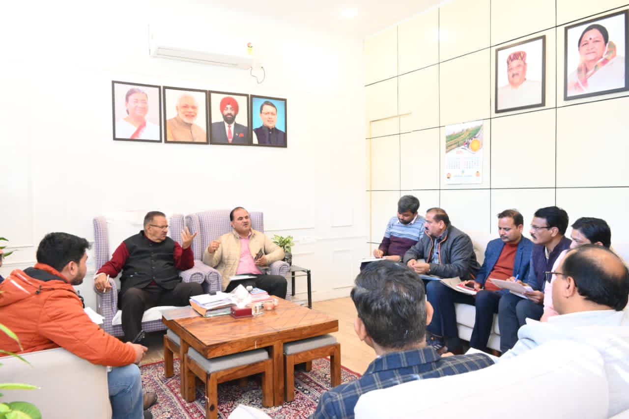 मसूरी विधानसभा क्षेत्र में चल रहे विकास कार्यों और क्षेत्र में आपदा के पुनर्निर्माण कार्यों समीक्षा करते कैबिनेट मंत्री गणेश जोशी