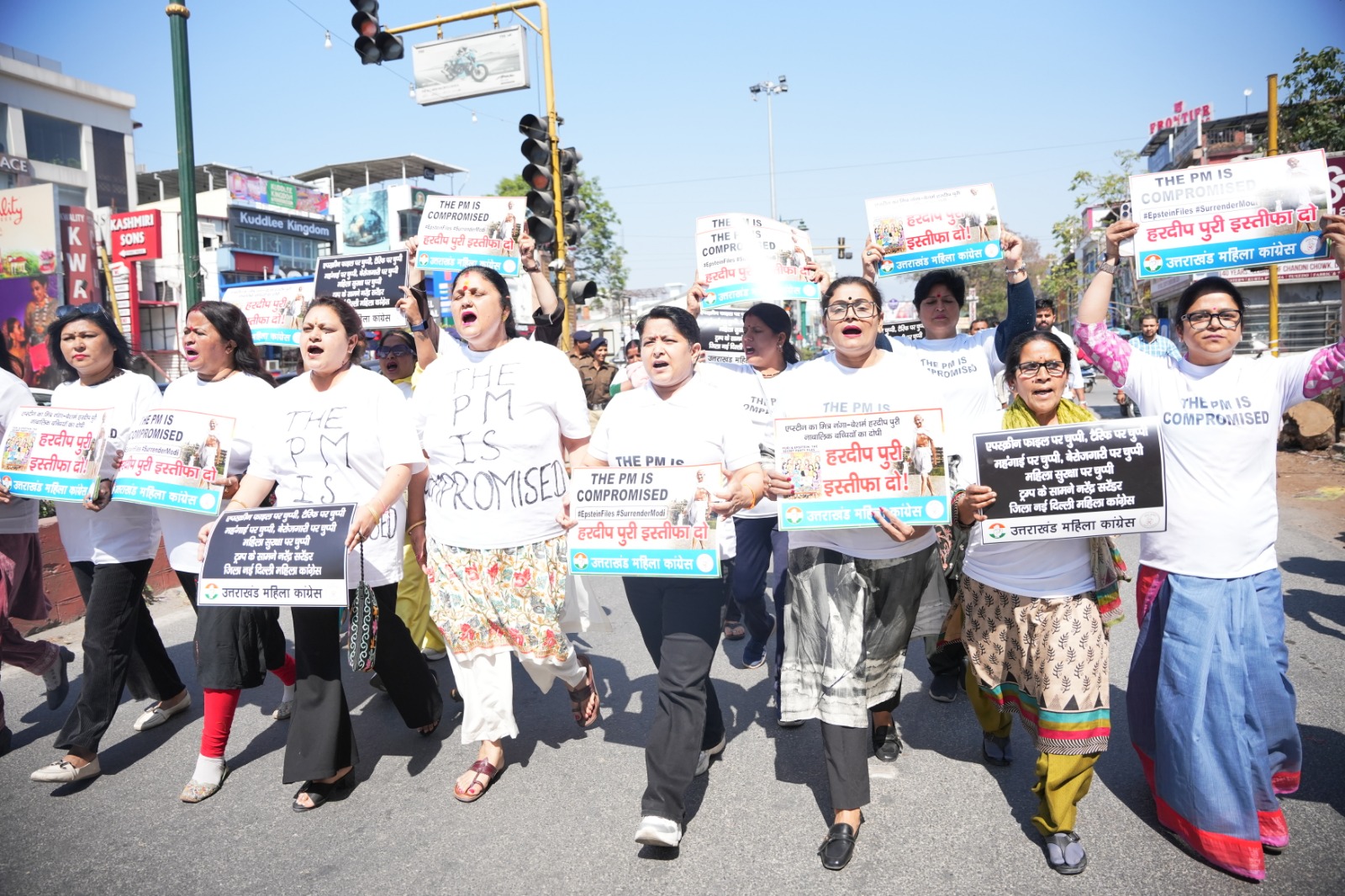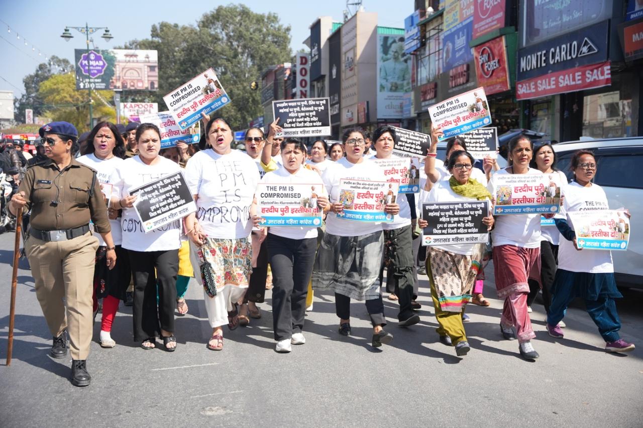 श्रमिक मंत्र, देहरादून। प्रधानमंत्री नरेन्द्र मोदी एवं केंद्रीय मंत्री हरदीप पुरी का नाम एपस्टीन फाइल में उजागर होने पर हरदीप पुरी के इस्तीफे की मांग को लेकर आज प्रदेश महिला कांग्रेस अध्यक्ष ज्योत रौतेला के नेतृत्व में महिला कांग्रेस कार्यकर्ताओं ने प्रदेश कांग्रेस कार्यालय राजीव भवन से गांधी पार्क-घंटाघर-पल्टन बाजार होते हुए तहसील चौक एवं वापस प्रदेश कांग्रेस कार्यालय तक  *THE PM IS Compromised*  लिखी विशेष पोशाक पहनकर विरोध-प्रदर्शन के साथ मार्च निकाला तथा केन्द्रीय मंत्री हरदीप पुरी के इस्तीफे की मांग की।